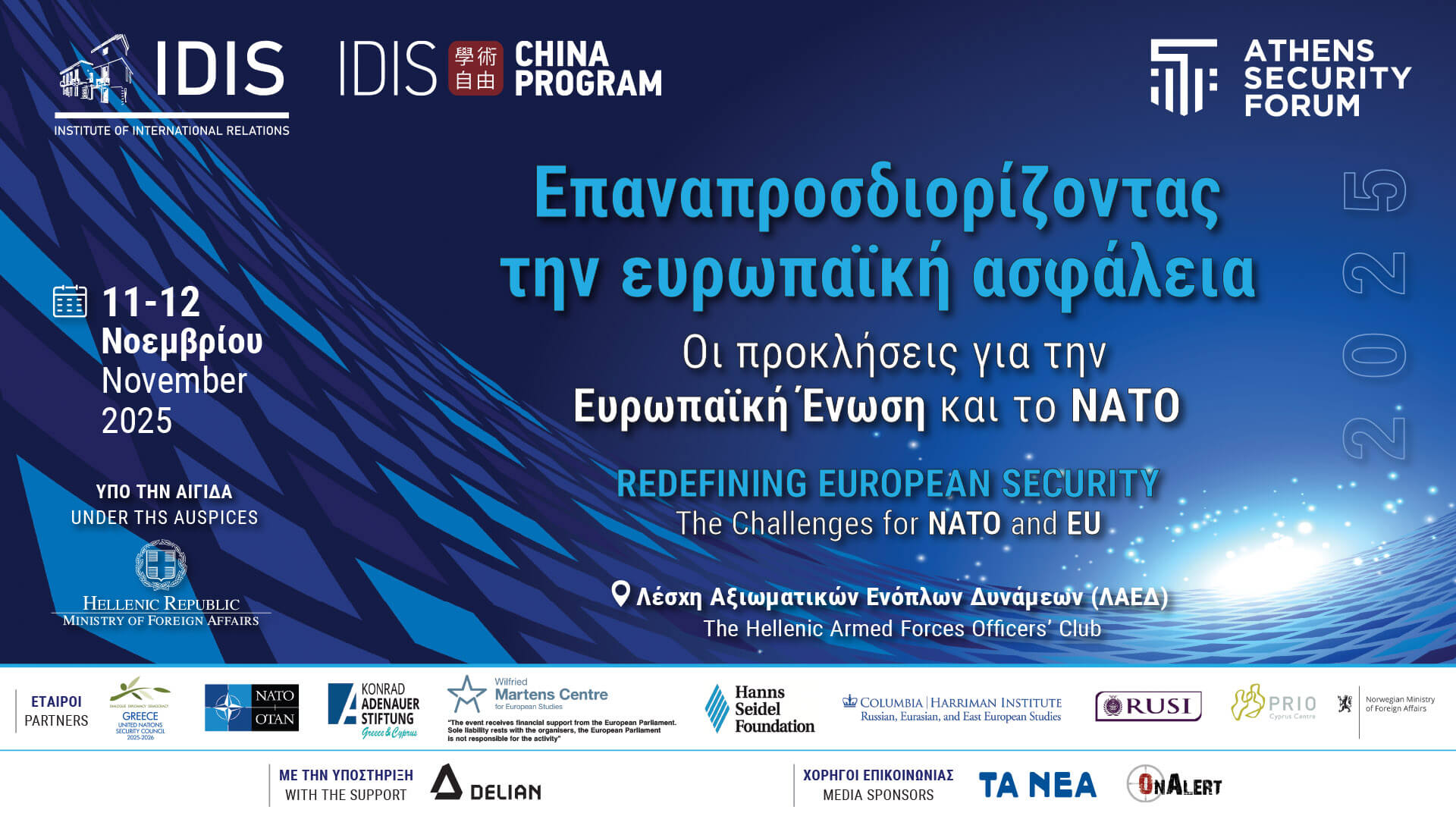 The Forum is an annual event promoting dialogue on the above issues organized by the Institute of International Relations (IDIS) as well as IDIS China Program and under the auspices of the Ministry of Foreign Affairs of Greece. The institutional partners of the 2025 edition are NATO, Konrad Adenauer Stiftung (Germany), Hanns Seidel Stiftung (Germany), Wilfried Martens Center (Brussels), Harriman Institute-Columbia University (U.S.A.), RUSI (U.K.) and PRIO (Norway).