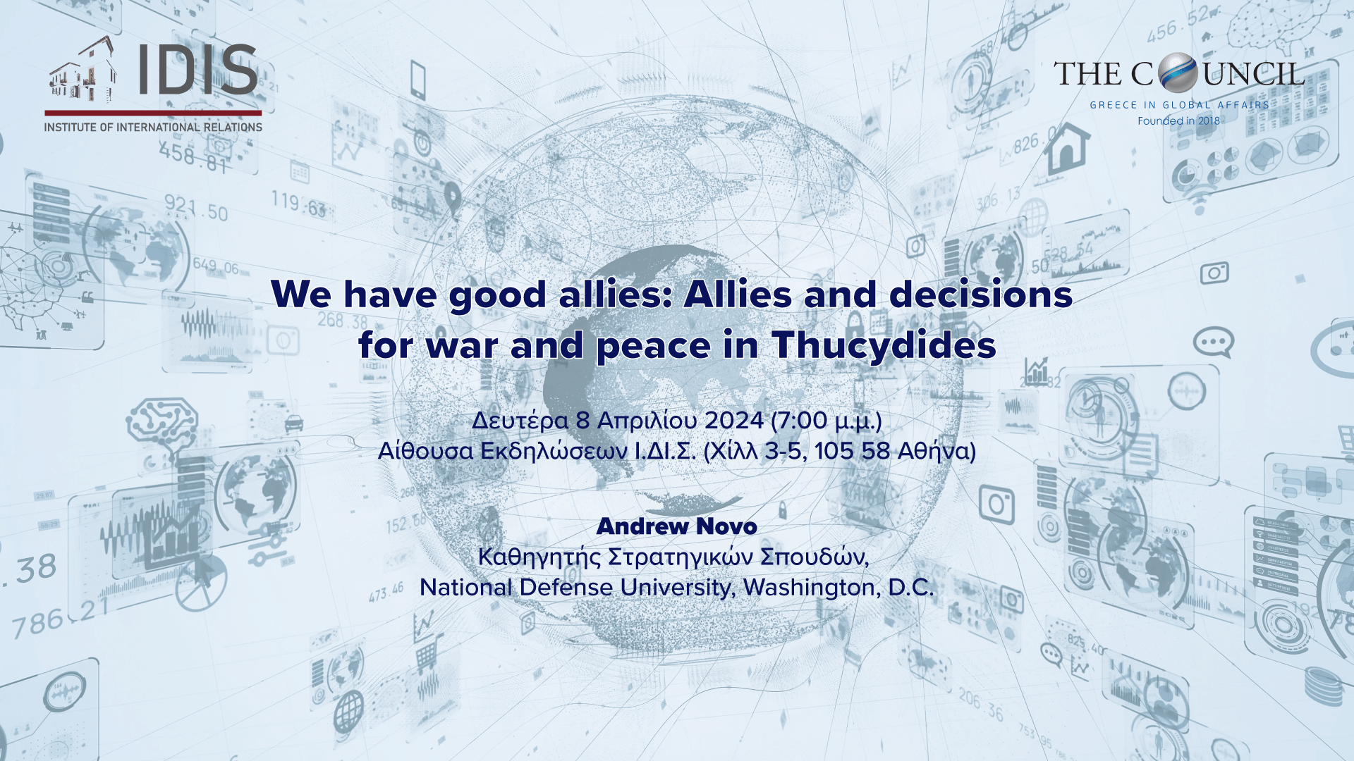 Events per year 20252024202320222021 All Events “The EU’s Relations with the Countries of the Middle East and the Gulf and the Bridging Role of the Republic of Cyprus: Prospects and Opportunities” Monday December 8, 2025 11:30 Eurasiatica: Russia (Muscovy-Siberia), Central and East Asia through the texts of Nikolaos Spatharis (late 17th century) Wednesday December 17, 2025 18:00 IDIS China Program – Workshop Maritime Security and Governance in the South China Sea: Legal, Environmental, and Human Rights Dimensions of Illegal and Distant Water Fishing Monday October 20, 2025 09:30 European Security at a Crossroads Tuesday June 24, 2025 10:30 Peace in the Eastern Mediterranean: Challenging an Illusion Monday May 5, 2025 11:30 Ukraine: The challenges for NATO, EU and Greece Monday September 30, 2024 NATO Enlargement: Central and South-Eastern Europe Success Story. Twenty Years of Peace and Security. The Challenges Ahead Wednesday June 12, 2024 China Today: Lectures by Professor Andrew Nathan, Columbia University Friday May 10, 2024 We have good allies: Allies and decisions for war and peace in Thucydides Thursday April 4, 2024 1 2 3 Επόμενη