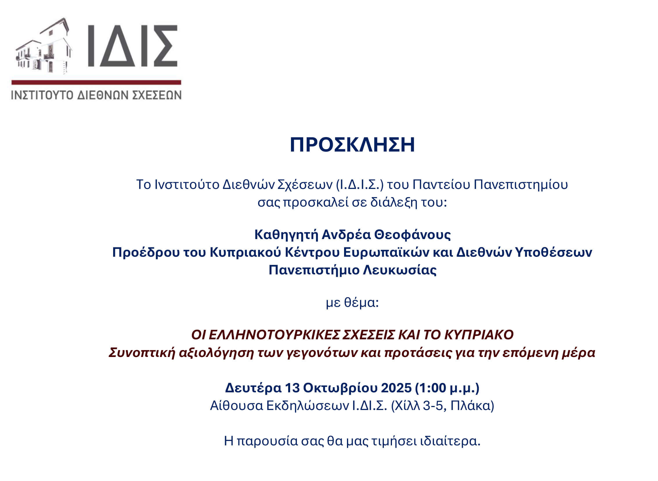Το Ινστιτούτο Διεθνών Σχέσεων (Ι.Δ.Ι.Σ.) του Παντείου Πανεπιστημίου σας προσκαλεί σε διάλεξη του: