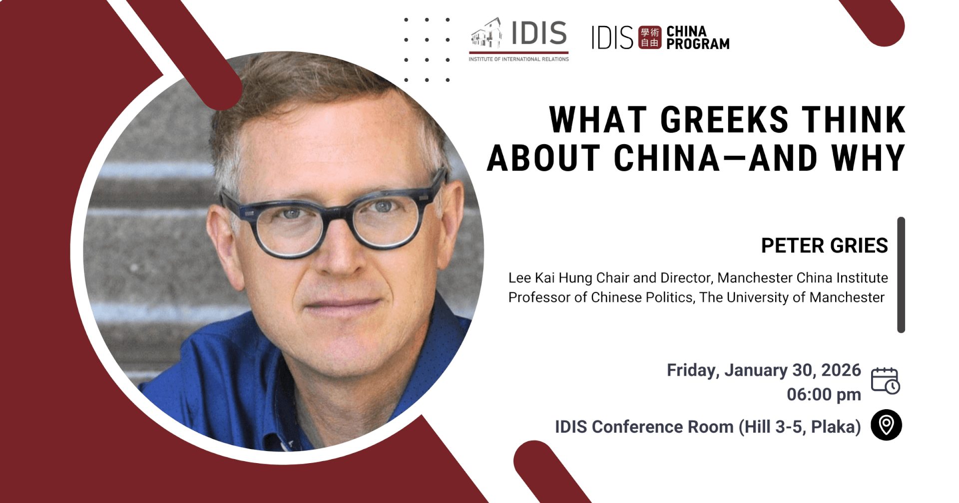 IDIS China Program is pleased to invite you to a lecture titled: What Greeks think about China – and Why, by Prof. Peter Gries, Lee Kai Hung Chair and Director of the Manchester China Institute and Professor of Chinese Politics at the University of Manchester.